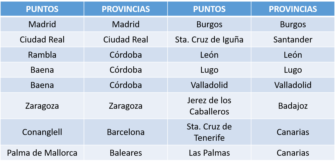 Zaragoza, Barcelona, Orense, La Coruña, Cádiz, Sevilla, Córdoba, Málaga, Jaén, Valencia,