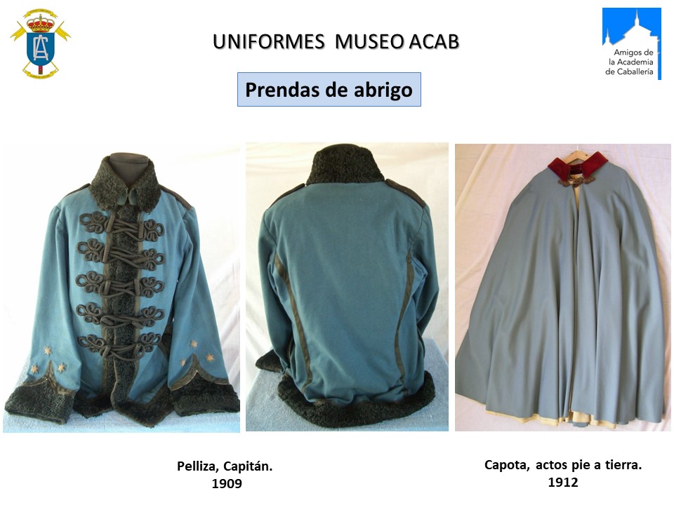 Los uniformes azules de paño en general, y en particular los del reglamento de 1909 para el Arma de Caballería, eran muy vistosos y llamativos pero, además de ser costosos, presentaban muchos inconvenientes en campaña. Hay que tener en cuenta que las prendas expuestas han ido cambiando el color original por diversas razones.