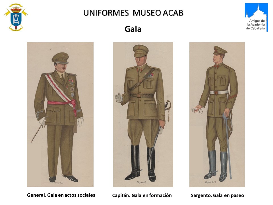 Gala.-Modalidad A y B (invierno y verano). Banda o cordón militar. En formaciones, sin banda ni cordón. Ceñidor de cuero y tirante, sable con tirante y fiador.