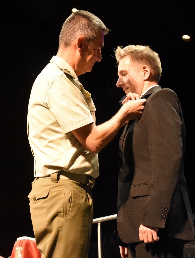 El Coronel Director de la ACAB imponiendo la insignia al Director de la Escuela Municipal de Música, Francisco Javier Alonso Zarzoso, que le identifica como Jinete de Honor