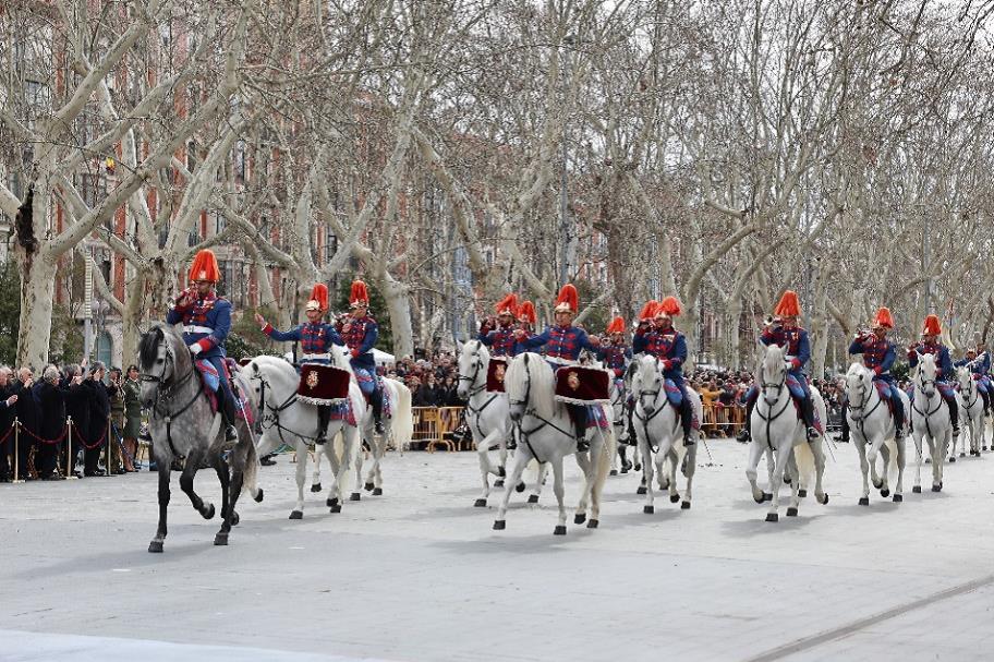 Para despedirse, la Banda de Clarines y Timbales del Escuadrón de Escolta Real interpretó el toque de ordenanza que suena en cada cuartel de Caballería al ponerse el sol, muy sentido por lo que representa: el de Oración de Caballería.