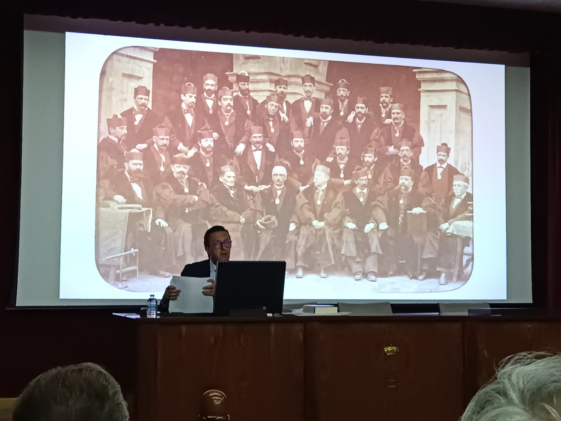 Finalizó su conferencia con una fotografía del claustro de la Universidad de Valladolid de la época. Estaba bajo la rectoría de López Gómez y contaba con la presencia de Juan Mambrilla y Julián Arribas, quienes, como algunos de los ya mencionados, han recibido un cumplido homenaje de la ciudad en el callejero de la misma.
