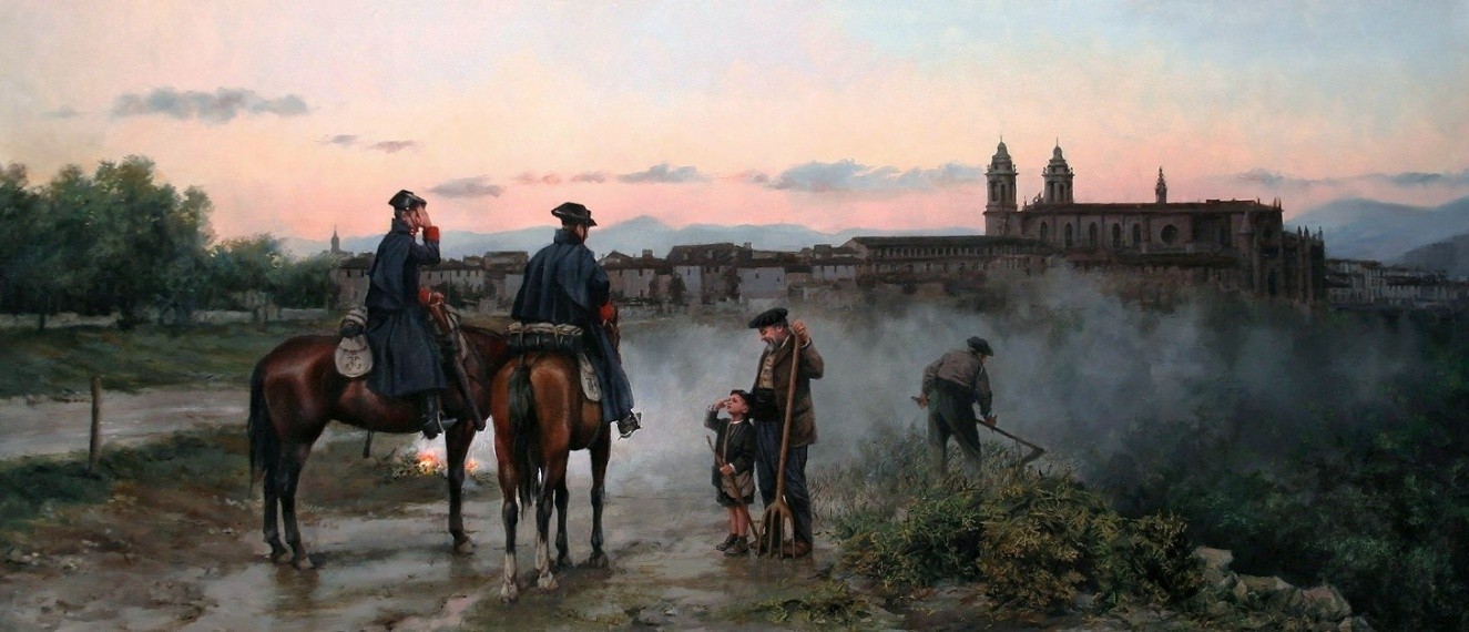 Los asistentes pudimos recordar y apreciar las figuras señeras de nuestra historia: el Cid, Alfonso VIII de Castilla, Pedro II de Aragón, Sancho VII de Navarra, los tres victoriosos en las Navas de Tolosa; Isabel la Católica, como defensora de los indios americanos; Cristóbal Colón, descubridor del Nuevo Mundo; Alonso de Ojeda, conquistador de Venezuela; el cardenal Cisneros, en la toma de Orán; Hernán Cortés, conquistador de México; Juan Sebastían el Cano, el primero que dio la vuelta al mundo; Pita da Veiga, uno de los tres que capturaron a Francisco I de Francia en Pavía; Francisco Pizarro con los treces de la fama hacia Perú; Alejandro Farnesio, el vencedor de Breda; Galvez, determinante en la independencia de Estados Unidos; Zumalacárregui, héroe de la primera guerra carlista, como recuerdo a los antecesores del pintor; general Prim con la bandera de España en Castillejos; y el teniente coronel Primo de Rivera al frente de la carga del regimiento de Caballería Alcántara.