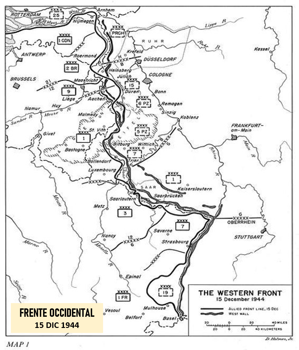 Guillermo Alcántara siguió con la explicación de que el general Eisenhower había elegido la región de las Ardenas por ser una zona que se podía conservar con un número de tropas reducido. Allí no había objetivos operativos para los aliados y el terreno ofrecía una favorable posición defensiva; no había carreteras y se sabía que los alemanes utilizaban la región del este de las Ardenas como zona de descanso. A principios de octubre, los aliados habían limitado sus ofensivas para mejorar sus líneas de abastecimiento. Con los aliados detenidos, el mariscal de campo alemán Rundstedt pudo reorganizar las unidades alemanas.