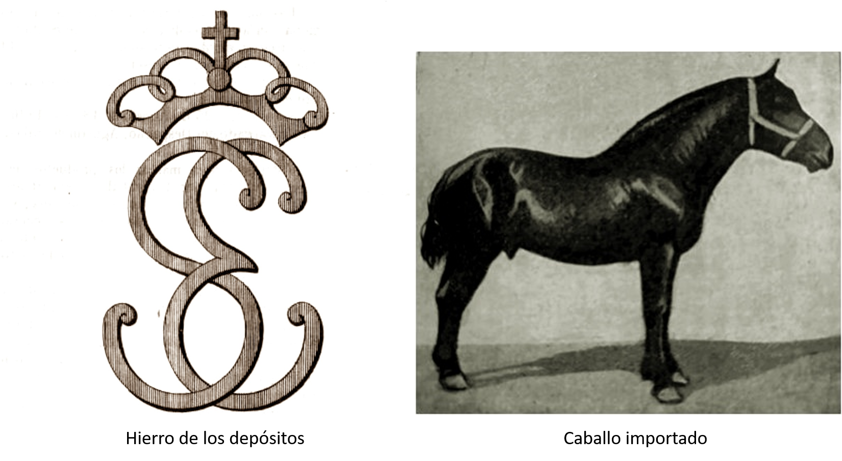 - Por orden del Director de Caballería de 28 de agosto de 1865 se adoptó para marcar los productos de las yeguas beneficiadas por los sementales del estado, un hierro que debe ponerse a toda cría que su dueño presente ene l depósito con el certificado de cubrición en el anca derecha, o en la izquierda si el referido dueño tuviera hierro propio. La citada marca es una "SE" entrelazadas por una corona real encima, y debajo el número de orden de cada depósito.