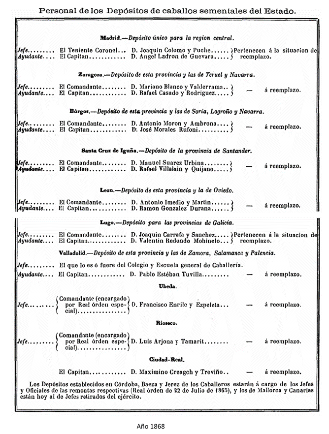 Para la cubrición de 1869 por sementales del Estado, se establecieron por órdenes del Gobierno provisional y del poder ejecutivo de 25 de febrero, 117 paradas con 433 sementales.