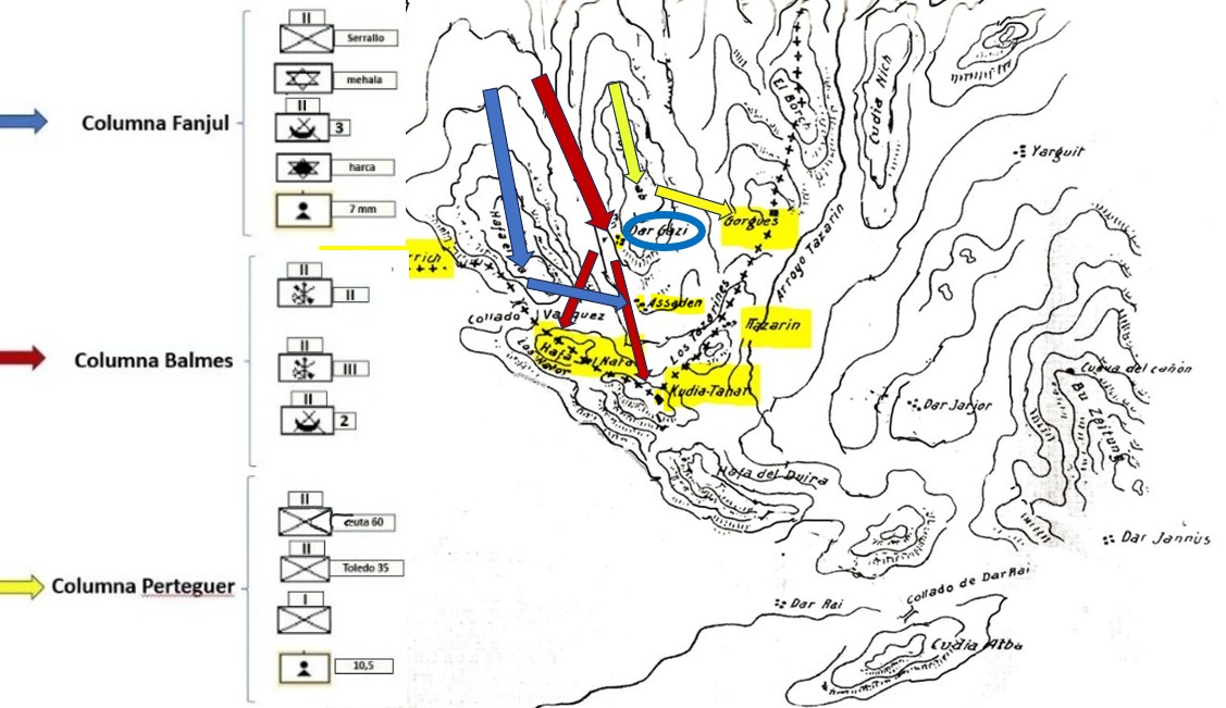 El general utilizó otras dos columnas; una mandada por el coronel Fanjul, que debía proteger el flanco oeste, progresar por el Hafa de Má y alcanzar los Nator; contaba con el batallón n.º 2 del Regimiento de Infantería Serrallo 69, la mehala de Ceuta, un tabor de Regulares de Ceuta n.º 3, una harca de la misma procedencia y una batería del 7 cm. La otra columna, mandada por el coronel Perteguer, estaba integrada por dos batallones pertenecientes al Regimiento de Infantería Ceuta n.º 60 y al Regimiento Expedicionario Toledo nº. 35, más una compañía de cazadores y una batería del 10,5 cm. Debía progresar por el barranco de Mers, hasta rebasar el macizo de Gorgues.