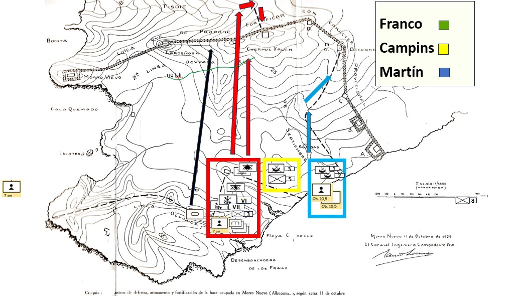 Flecha roja: flanco de la brigada de Ceuta, apoyada por la mehala y la II bandera; flechas negras: refuerzos efectuados por las banderas. Línea amarilla: límite de la extensión de la cabeza de playa.