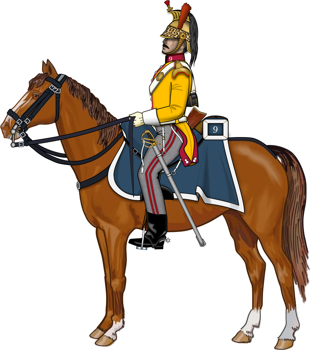 Como caso particular, los dos regimientos de coraceros continuaron con su tradicional casco de hierro con cimera de latón adornado con un plumero blanco; casaca de paño encarnado; pantalón gris para diario, blanco para parada y botas altas hasta la rodilla.