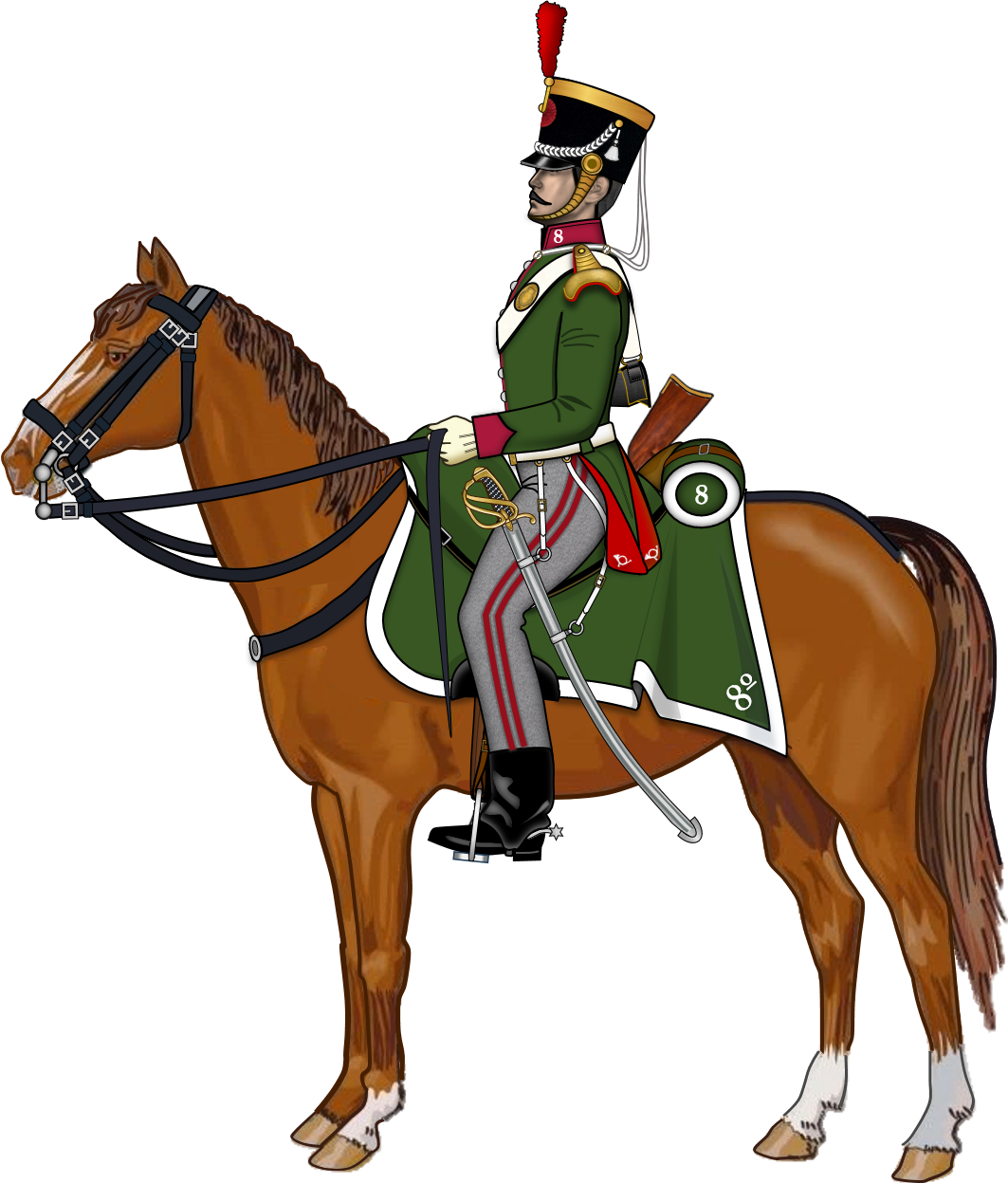 En cuanto a los uniformes de la Caballería Ligera, las nuevas casacas se mantuvieron cortas y de paño color vede oscuro, pero las vueltas, el cuello y los vivos, pasaron a ser de color carmesí. El pantalón continuó siendo gris, incorporando dos tiras de color carmesí sobre las costuras laterales. Como prenda de cabeza siguió usándose el chacó propio de los cazadores, que, con el tiempo, se convertiría en una prenda característica y tradicional de la Caballería Ligera. Para las ocasiones de gala, se adornaba con un plumero de color rojo. La maleta de grupa, de forma cilíndrica, era de color verde con vivos blancos, al igual que el "schabrack" que cubría la silla de montar. En las puntas traseras de éste y en los lados de la maleta, figuraba el número del regimiento.
